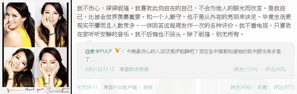 事實上,昨晚網友的評論並未「@」伊能靜或庾澄慶,但伊能靜卻在看到評論後,今(1日)凌晨在微博上發了一篇百字聲明,說明自己並不傷心,也不會為他人的眼光而改變,且要一併回答每周發作一次的各種評價。網友就質疑她是否會錯意?對此,下午她立刻再度回應:「我沒會錯意,說了是一併回答。包括被媒體問、被關心的人問、還有在這裡留言的人們。禮貌回覆是很好的習慣,多和大家交流,也很好啊!」